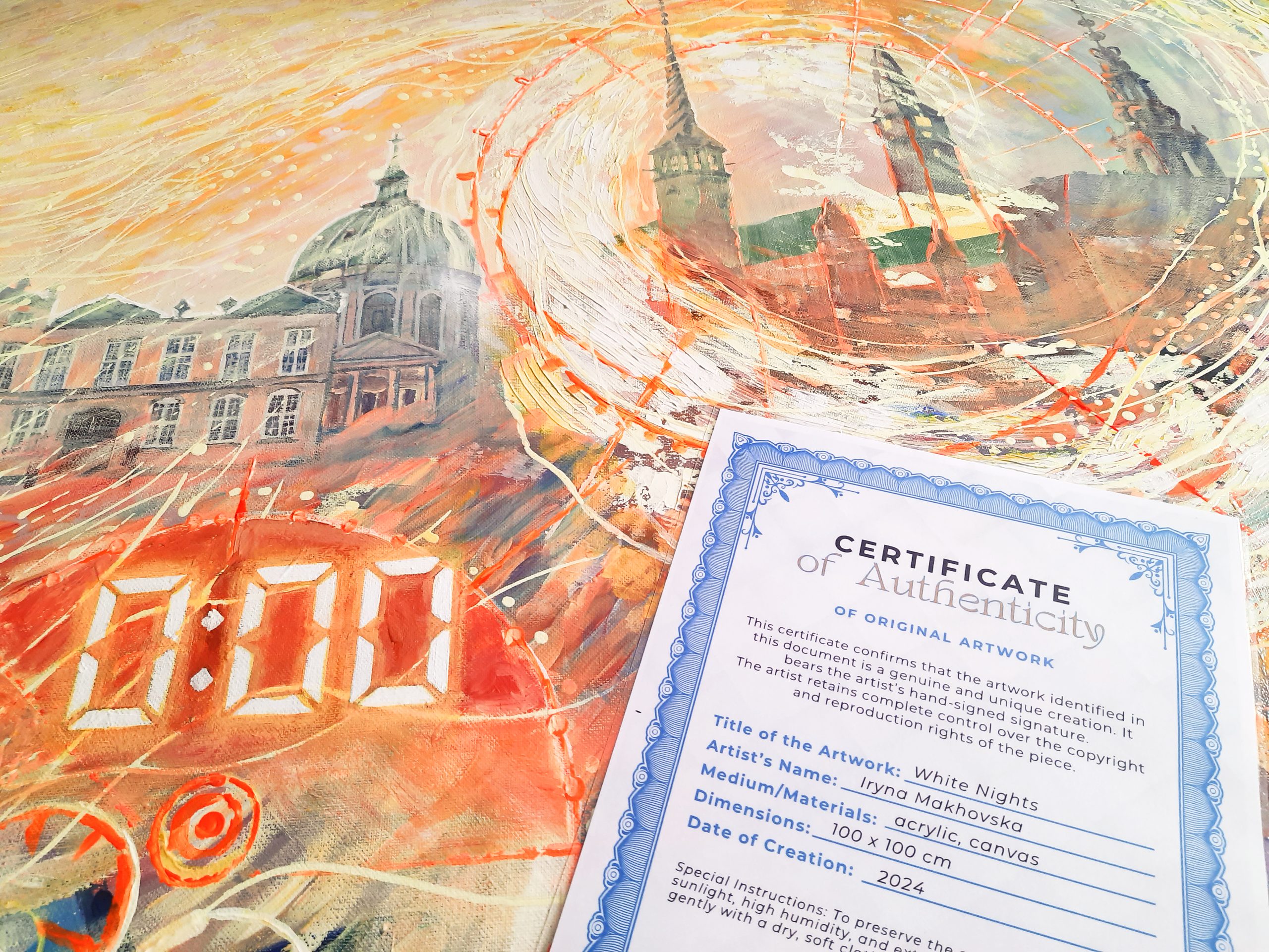 Her works have been exhibited in Denmark, Ukraine, and other countries in both solo and group exhibitions. In 2023, her painting appeared during the New Year’s speech of Denmark’s Prime Minister, Mette Frederiksen, as a symbol of solidarity with Ukraine — a deeply meaningful moment that connected her art to a wider public voice of support.